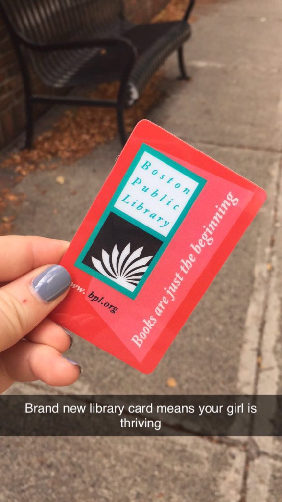 It’s now been over a month since I’ve moved, and I’m getting ready to start my fifth week of classes. I’ve settled into my apartment and have (almost) gotten used to my hour-long commute to campus. So far I’ve spent my weekends exploring Boston and doing a lot of pleasure reading. I’m getting ready to start an on-campus job as an administrative assistant, and I’ve got a lot of exciting (blog-worthy) things coming up. I can’t wait to keep sharing my thoughts on books, my life as a grad student, and my adventures in Boston with you all!