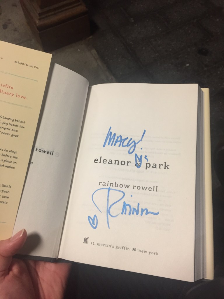 This past week, I attended an event on Rainbow Rowell’s Wayward Son book tour held by the Brookline Booksmith. Rowell talked about her books and writing, read from Wayward Son, and took questions from audience members. After the conversation portion of the evening, I got my copy of Eleanor and Park signed by Rowell and told her about the paper I wrote for my Midwestern Literature course last spring where I discussed Fangirl and The Wizard of Oz as literary compliments of each other. It was an incredible evening, and I had a great time in the middle of the week.