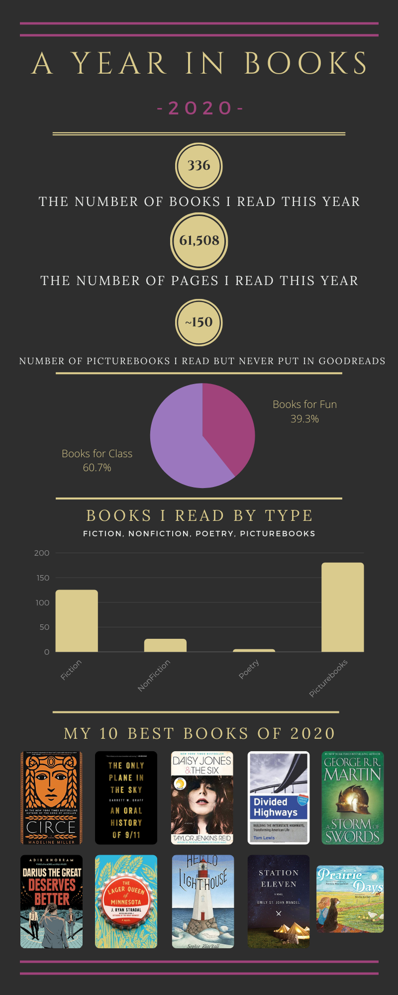 And if you’ve made it this far, you’re actually interested in this in my life or you scrolled down here to find out how much I read this year and what my favorite books of the year were! Making the infographic is one of my favorite parts of the year-in-review post! Thanks for tagging along in my blogging and in my life this year and I can’t wait to see what 2021 brings.