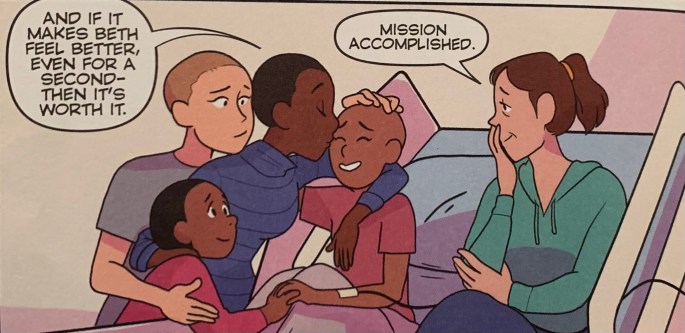 Speaking of Mr. March, in a modern setting he can’t be fighting the civil war, and both graphic novels have him deployed overseas in the US Military. Jo implies this through context clues (Mr. March seen wearing dogtags and with a military style haircut during a video call), and simply saying he’s overseas which connotes military work of some sort.