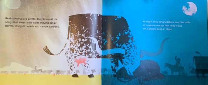 Real Cowboys is a picturebook that works to reframe the work of cowboys in a way that challenges the macho tough-guy stereotype that is presented in the Western Genre. One of the things I love about this picturebook are the colors. Most spreads are dominated by one color that works to establish time of day or a mood for the page. The cowboys and cattle are distinct in some spreads and ethereal in others.