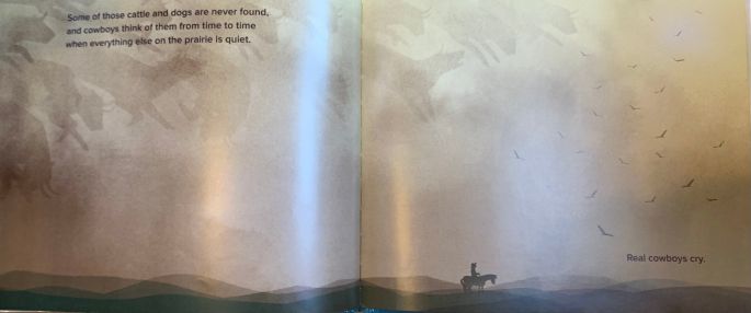 One of the spreads I like the most is in the aftermath of a stampede where the text reveals that “Real cowboys cry” when thinking about the cattle and the cattledogs that they’ve lost. The tannish hue is reminiscent of a dust storm and the single silhouette of the cowboy with the buzzards at the bottom of the recto is very effective at creating a lonely scene and the proportion of land to sky feels so much like the prairie to me.