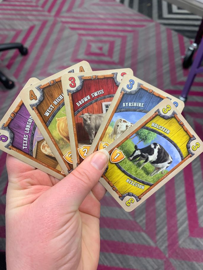 I’m into this game because of the cows and I often lean into a cow-heavy strategy (give me all the Texas Longhorns), but one of the great things about this game is that it’s got a few varied strategies. It’s both an engine building game and a deck building game so while you’re collecting advantageous cows (building your deck), you’re also hiring staff and placing buildings that give you extra actions (building your engine).